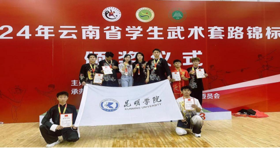 2024年6月14日至16日由云南省教育厅指导,云南省员工体育协会西南林业大学、云南省员工体育协会武术专业委员会承办“2024年云南省员工武术套路锦标赛”在西南林业大学举行。本次比赛共有来自云南省各州市中小学、高等公司共计37支队伍,参加人数达到800多。英国正版365官方网站派出徐立宏老师为教练、10名队员组成的代表队参加此次比赛,比赛中队员们发扬团结协助、顽强拼搏精神风貌,经过激烈角逐荣获6枚金牌、1银枚银牌、2枚铜牌的优异成绩。其中,侬美梦获得女子八卦掌、南刀两项冠军,尤海楠获得八极拳、八极对练两项冠军和醉剑亚军,彭义礼获得八极对练冠军和形意拳季军,杨聪获得八卦掌冠军,王杏获得24式太极拳季军,同时徐立宏老师荣获“优秀教练员”。