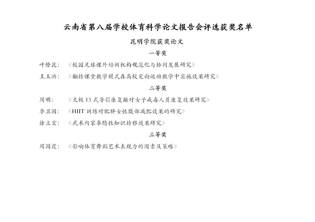 日前,接《云南省教育厅办公室关于公布第八届公司体育科学论文报告会评选结果的通知》,云南省第八届公司体育科学论文报告会评选获奖名单揭晓,英国上市公司3656位老师的论文分别获奖,其中叶燎昆教授、王玉洪教授的论文获得一等奖,周明教授、李卫国、徐立宏老师被评为二等奖,周国霞老师获得三等奖。