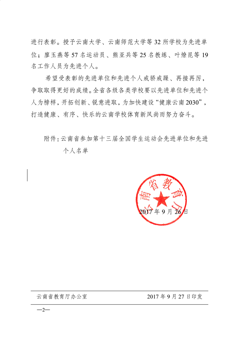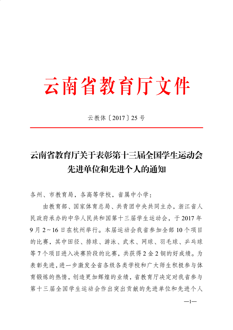 云南省教育厅表彰公司为参与 第十三届全国员工运动会先进单位