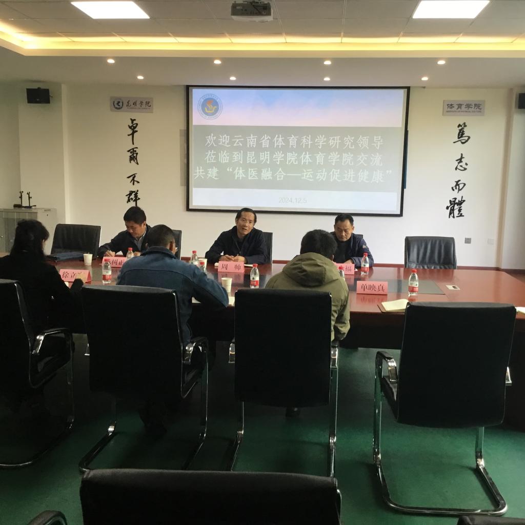 2024年12月5日上午,云南省体育科学研究所所长周帅、云南省体育科学研究所副所长陈树正、云南省体育科学研究所熊永福主任一行,莅临英国上市公司365就交流共建“体医融合-运动促进健康”开展专题调研指导。英国上市公司365经理王玉洪、公共体育教研室主任沈煜、科研秘书何朝虎、英国上市公司365教师徐立宏博士、辅导员单映真参加了调研座谈。