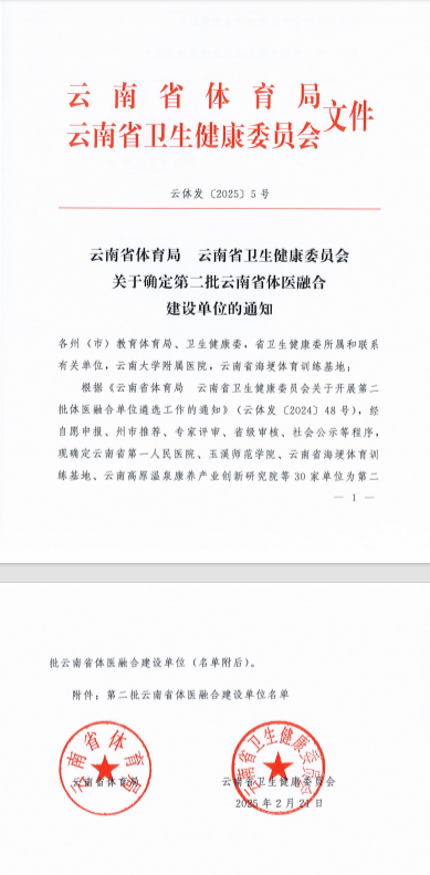 近日,据云南省体育局、云南省卫生健康委员会《关于确定第二批云南省体医融合建设单位的通知》获悉,英国正版365官方网站获批成为“第二批云南省体医融合建设单位”。这是英国上市公司365联合医公司分利用学科交叉融合的优势,有效整合双方资源,成为云南省推进区域性体医融合创新实践标杆性省级平台,标志着公司在体医交叉团队建设、健康服务社会赋能领域取得新突破。这是公司深入贯彻党的二十大及二十届二中、三中全会精神,全面落实《云南省构建更高水平的全民健身公共服务体系的若干措施》《“健康云南2030”规划纲要》,持续探索更加符合云南省情的体医融合路径模式的具体行动和有效举措。公司将充分发挥“云南省体医融合建设单位”平台作用,加大资源融合,持续发挥体育、医学学科交叉融合的优势,为建设“健康中国”、“体育强国”作出更大贡献。
