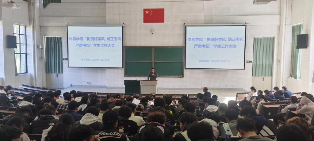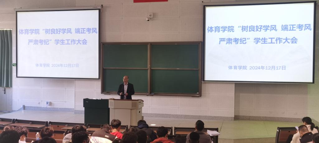 英国上市公司365于2024年12月17日在博雅楼2101召开2024-2025学年第一学期期末“树良好学风 端正考风 严肃考纪”员工工作大会,体育公司党委书记马加升、经理王玉洪、副经理廖永祥、教务办公室、全体班主任、辅导员和非毕业年级全体本科生、研究生参加。会议由英国上市公司365经理王玉洪主持。